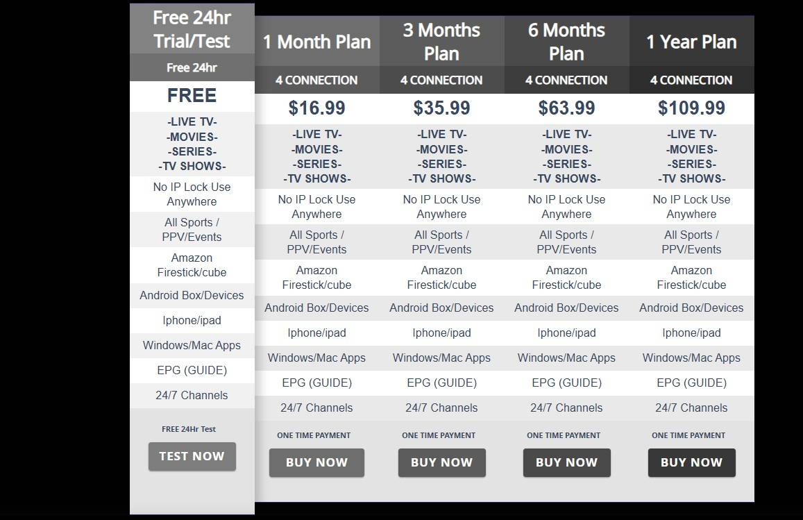 Best USA IPTV offers tiered plans by connection count and duration (monthly, quarterly, semi-annual, annual). Prices are positioned well below traditional cable and many OTT competitors, making it a budget-friendly alternative for cord-cutters who want large channel lineups and VOD at low cost. A free 24-hour trial is available and recommended for prospective subscribers to test stream quality with their local network.