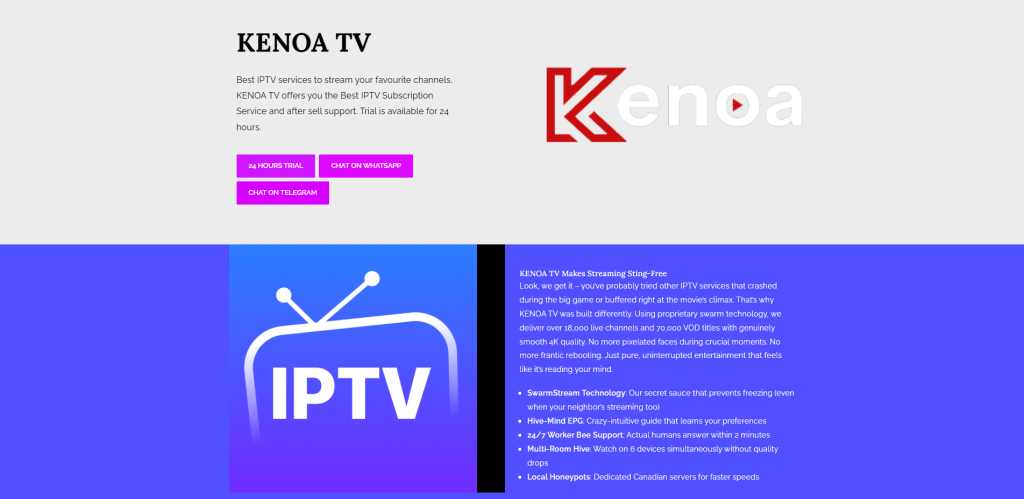 KenoaTV claims to offer thousands of live TV channels, including entertainment, news, kids’ channels, and international content, along with a large video-on-demand (VOD) library.