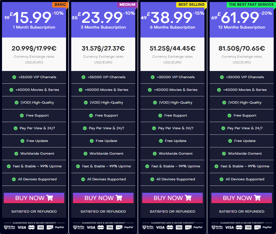 Xstream IPTV UK lists tiered subscriptions (monthly, quarterly, semi-annual, annual) with promotional Black Friday pricing. Example tiers include a one-month plan, 3-, 6- and 12-month options with discounts applied for longer commitments. They also provide reseller credit packs priced by credit.
